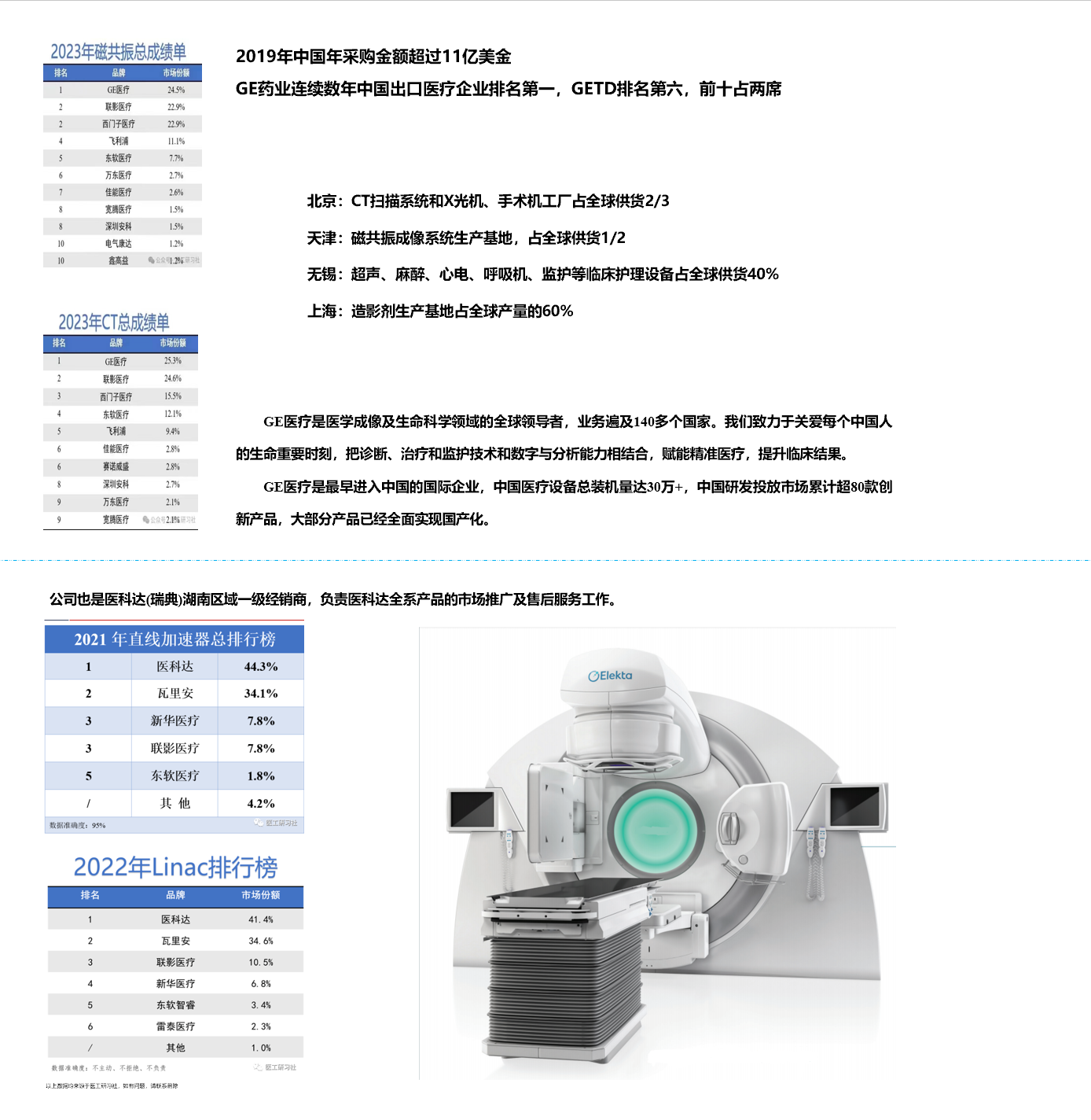 公司是美國通用電氣(GE)湖南區域一級經銷商,負責三級醫院及基層醫院臨床設備的銷售推廣工作。